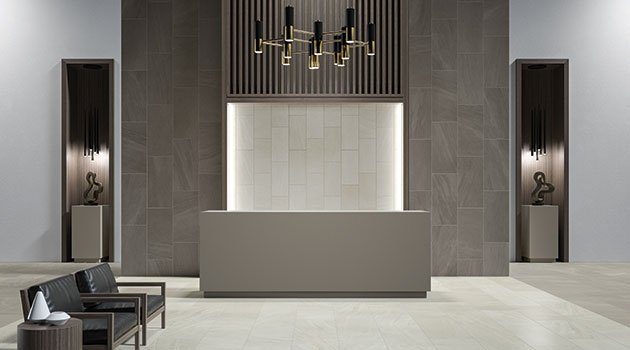 Altamere meets all the criteria to be used on floors as well as vertical surfaces like shower walls, backsplashes and fireplace surrounds. The appealing colors in the collection are Alpine White, Charcoal Rock, Mountain Beige and Summit Gray.
