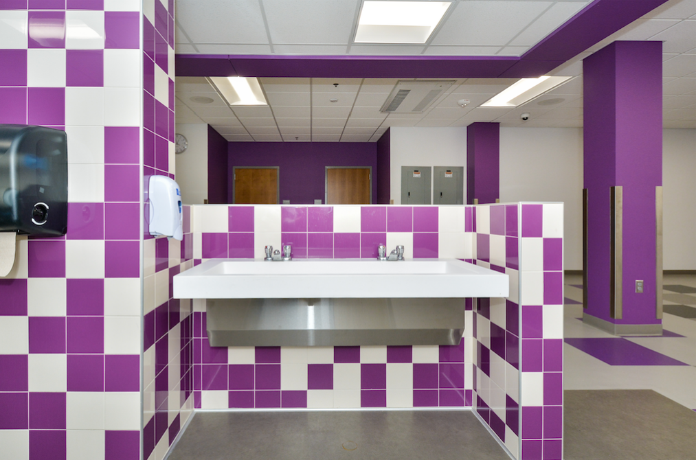 Since there were only three wings, the project shifted to giving each grade their own color. To meet the number of grades, Ruby Wine and Mazarine Blue were added to the project to bring the total up to six. The main floor, common path to the gym, and cafeteria use the four school colors in the flooring. The cafeteria space also has a blast of all four colors on the floors and walls. The color coding created an identity between the school’s wings and its grade, creating a system that provides just as much function as it does style.
