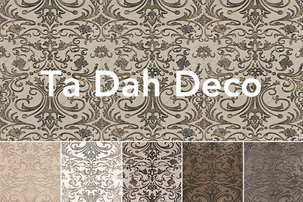 Ta Dah Deco – Inspired by vintage wallpaper, this delicate decorative tile is best displayed on vertical surfaces. Available in: calacatta with silver leaf inlay, chinchilla with patina gold leaf inlay, fleece with vanilla bean wash, sable with espresso bean wash, mink with espresso bean wash, and chinchilla with espresso bean wash.
