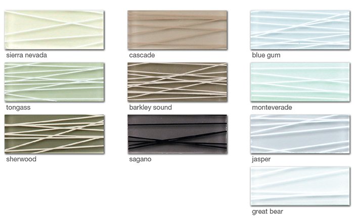 Shadows glass tiles are available in 6″ x 12″, 8″ x 12″, 12″ x 12″, 8″ x 16″, 12″ x 16″, and 16″ x 16″ formats.