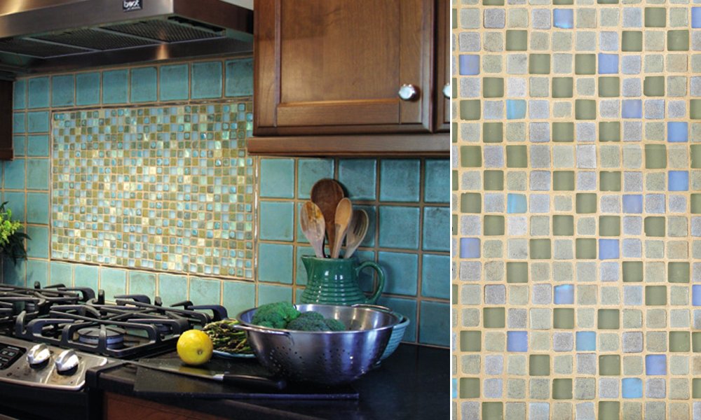 Kitchen backsplash features a cool mosaic blend of desert blues and greens
