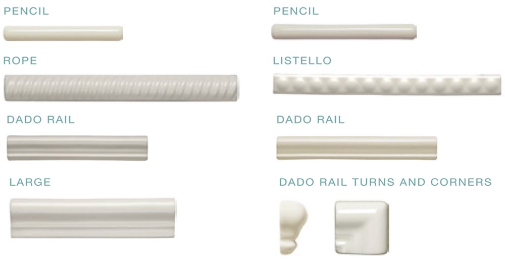 Moldings are based on classical English designs including Victorian dado rails and Georgian cornices. Available in a selection of gloss colors to enhance and complement field and half tiles. Other colors in the can be made to order.