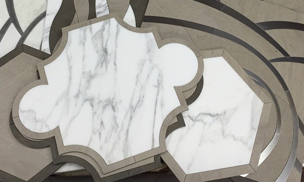 Freccia mosaic in Pantera, Flamma water cut mosaic, and curvaceous Turbine in calacatta and stainless steel