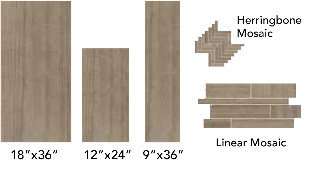 Large format 18″x36”, 12”x 24″, 9″x36″, herringbone mosaic, and linear mosaic tiles.