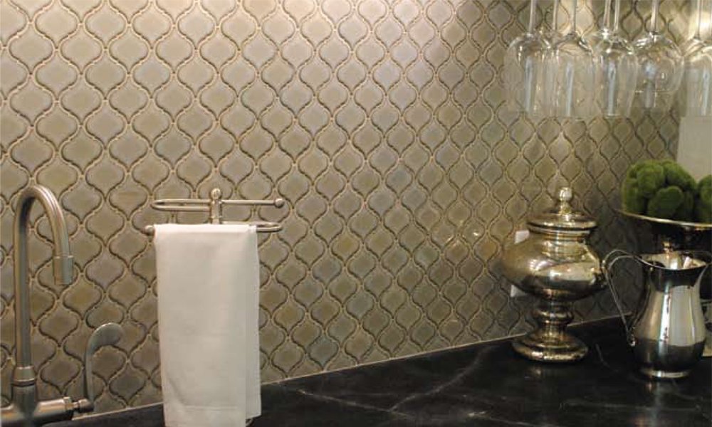 Tessen kitchen backsplash in Luna. Single color installations emphasize the repeated forms and elegant patterns of the collection.