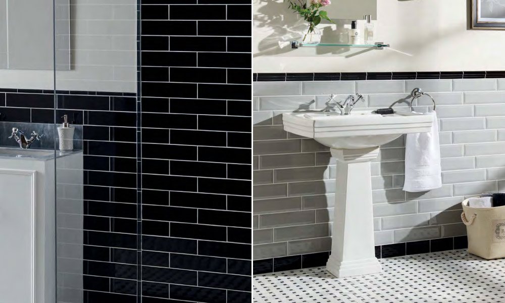 Sleek and narrow black subway tiles have a contemporary edge. The same size tiles with beveled edges connotes a more traditional aesthetic.